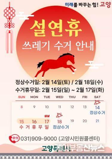 케이부동산뉴스 김교민 기자 | 고양특례시는 설 연휴를 앞두고 시민들이 깨끗하고 쾌적한 환경에서 명절을 보낼 수 있도록 ‘설 연휴 생활쓰레기 관리대책’을 마련하고 비상 대응체계를 운영한다.