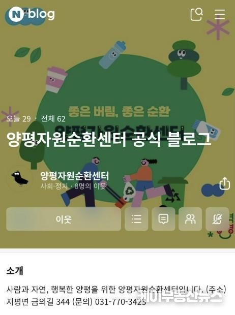 케이부동산뉴스 김교민 기자 | 양평군은 지난 12일 군민과의 소통을 강화하고 자원순환 정보 전달을 확대하기 위해 ‘양평자원순환센터 공식 블로그’를 개설·운영한다고 밝혔다.