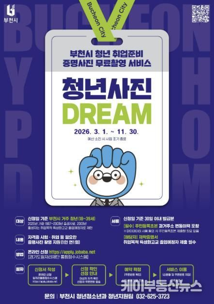케이부동산뉴스 김교민 기자 | 부천시는 청년의 구직활동과 사회진출을 지원하기 위해 자격증 취득과 취업 준비 과정에서 필요한 증명사진 촬영을 지원하는 ‘부천 청년 사진 드림(Dream) 사업’을 추진한다고 13일 밝혔다.