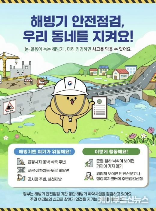 점검 대상은 급경사지, 건설공사장, 배수지 등 사고 발생 우려가 큰 시설 119곳으로, ▲비탈면 균열 ▲시설물 주변 지반 침하 여부 ▲구조물 변형 여부 등 해빙기 특성에 따른 위험요인을 중점적으로 확인할 예정이다.
