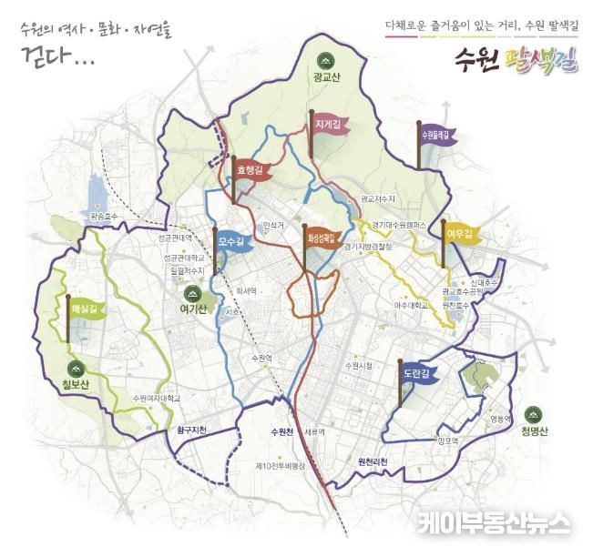 케이부동산뉴스 김교민 기자 | 수원특례시는 수원 전역 수원팔색길 구간에서 도시개발로 단절된 노선을 복원하고 노후 이정표와 시설물을 교체하는 ‘수원팔색길 종합정비’를 5월까지 추진한다.
