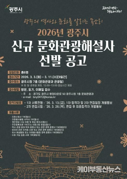 케이부동산뉴스 김교민 기자 | 광주시는 2026년도 광주시 문화관광 해설사 신규 선발을 위해 오는 3월 3일부터 11일까지 원서 접수를 실시한다고 25일 밝혔다.