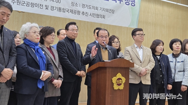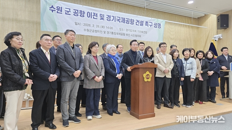 수원 군공항 이전 및 경기통합국제공항 추진 시민협의회(회장 조철상)는 26일 경기도의회에서 기자회견을 열고 “경기도가 최종 후보지를 국토교통부에 건의하지 않을 경우 향후 5년간 사업이 사실상 멈출 수 있다”며 도 차원의 결단을 요구했다.