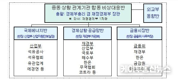 정부는 경제부총리를 중심으로 중동 상황 관련 실물경제, 에너지, 금융시장, 중동 동향 등에 대한 관계기관 합동 비상대응반을 가동하고 중동 현지 상황과 국내외 금융시장, 에너지·수출·해운·항공·공급망 등 실물경제 영향을 24시간 모니터링해 나갈 계획이다. 아울러, 이상징후 발생 시 준비된 상황별 대응계획(Contingency plan)에 따라 관계기관 간 공조 하에 신속하게 대응해 나갈 계획이다.