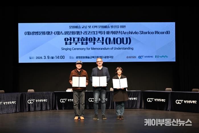 케이부동산뉴스 김교민 기자 | (재)광명문화재단은 3월 9일 오후 2시 광명극장에서 (재)노원문화재단, 리코르디 역사 아카이브(Archivio Storico Ricordi)(이하 리코르디)와 ‘문화예술 교류 및 지역 문화예술 발전’을 위한 업무협약(MOU)을 체결했다고 밝혔다.