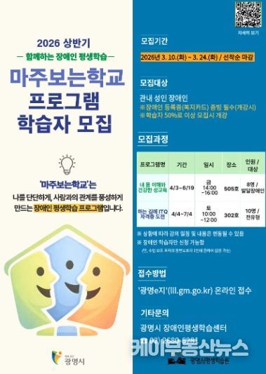 케이부동산뉴스 김교민 기자 | 광명시 평생학습원은 장애인 학습자의 자기 이해와 사회 참여 역량 강화를 위한 평생학습 프로그램 ‘마주보는학교’의 상반기 수강생을 오는 24일까지 모집한다.