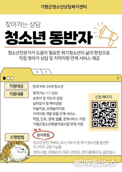 케이부동산뉴스 김교민 기자 | 가평군청소년상담복지센터는 청소년 상담 분야 자격과 경험을 갖춘 전문상담사가 위기 청소년을 지원하는 ‘청소년동반자 프로그램’을 운영중이라며 적극적인 이용을 당부했다.