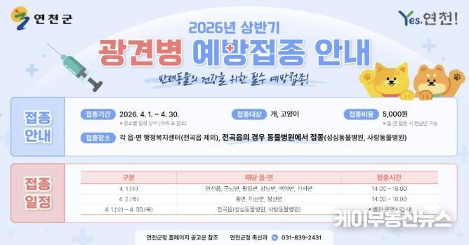 케이부동산뉴스 김교민 기자 | 연천군은 오는 4월 1일부터 4월 30일까지 ‘2026년 상반기 광견병 예방접종’을 일제히 실시한다고 밝혔다. 실시 대상은 연천군 관내 가정에서 사육하는 개, 고양이 등 광견병 전염 우려가 있는 동물이다.