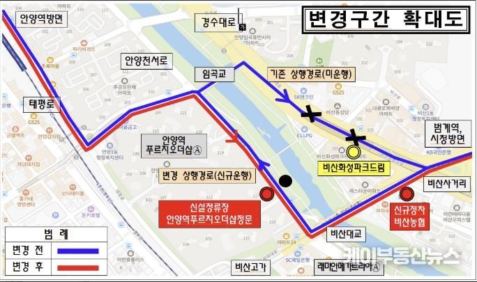 반면, 안양역에서 범계역 방면 운행 시 정차하던 기존 '비산화성파크드림' 정류장은 노선 효율화를 위해 더 이상 경유하지 않는다. 기존 이용객은 인접한 '비산농협'이나 '비산사거리.이마트' 정류장을 이용할 수 있다.