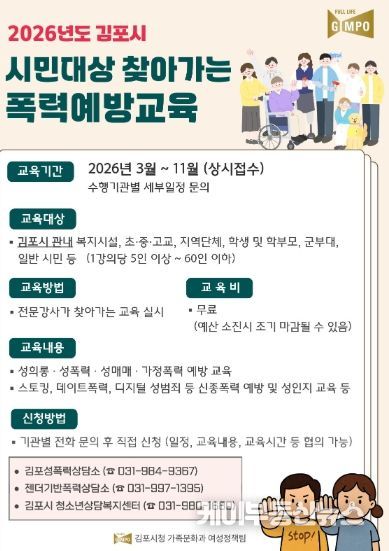 케이부동산뉴스 김교민 기자 | 김포시는 시민의 건전한 성 가치관 형성과 폭력 예방 의식 확산을 위해 ‘2026년 김포시 시민대상 폭력예방교육’ 사업을 3월부터 11월까지 추진한다고 밝혔다.