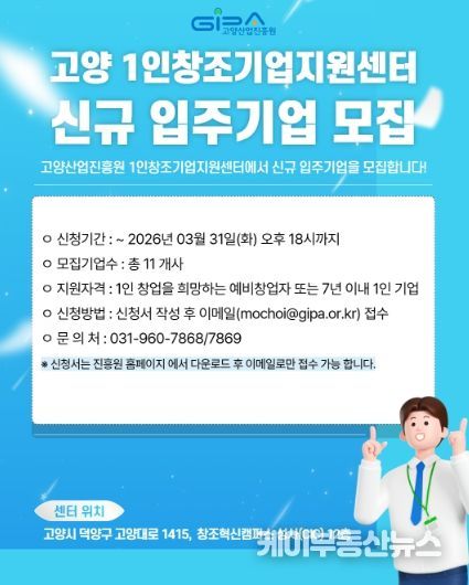 케이부동산뉴스 김교민 기자 | 고양산업진흥원이 ‘고양 1인 창조기업 지원센터’ 2026년 1차 신규 입주기업을 모집한다.