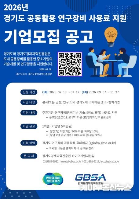 케이부동산뉴스 김교민 기자 | 경기도와 경기도경제과학진흥원이 도내 중소·벤처기업의 연구개발(R&D) 경쟁력 강화를 위해 ‘2026년 경기도 공동활용 연구장비 사용료 지원 사업’을 추진한다.