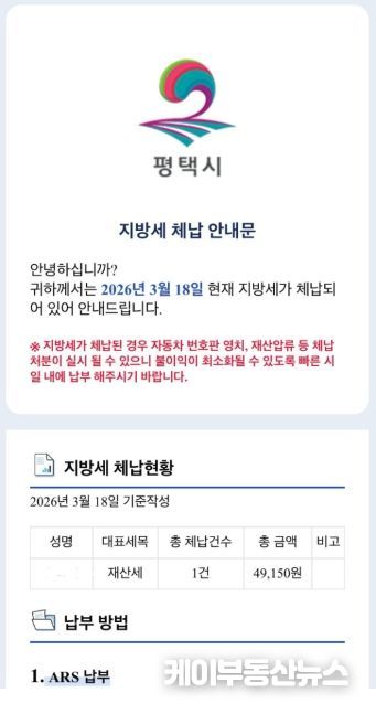 케이부동산뉴스 김교민 기자 | 평택시는 ‘모바일 전자고지 시스템’을 활용해 지방세 체납자 1만7천여 명을 대상으로 오는 23일과 24일 이틀 동안 전자문서 형태의 체납안내문을 발송할 예정이다.