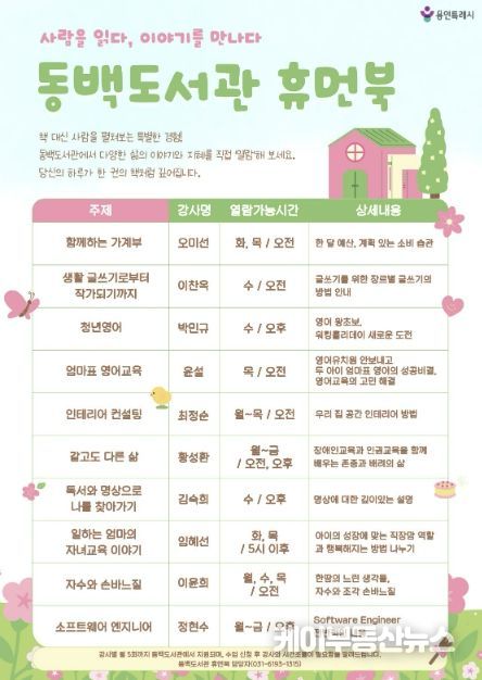 케이부동산뉴스 김교민 기자 | 용인특례시 동백도서관은 오는 4월 1일부터 ‘휴먼북’ 프로그램을 정비해 본격 운영한다고 23일 밝혔다.