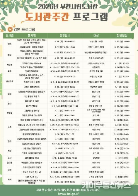 행사와 프로그램에 대한 자세한 내용은 부천시립도서관 홈페이지에서 확인할 수 있으며, 문의는 해당 도서관으로 하면 된다.