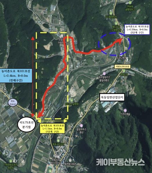 북101호선은 북면 제령리 목동교회 인근에서 소법리 골말교 인근까지 이어지는 총 2.4km 구간이다. 1단계 사업은 2023년 12월 준공과 함께 도로를 개통했으며, 군은 2024년부터 2단계 구간 노선 지정을 위한 행정절차를 진행해 왔다. 이어 올해 1월 보상 협의를 완료하면서 4월 공사 착공을 앞두게 됐다.