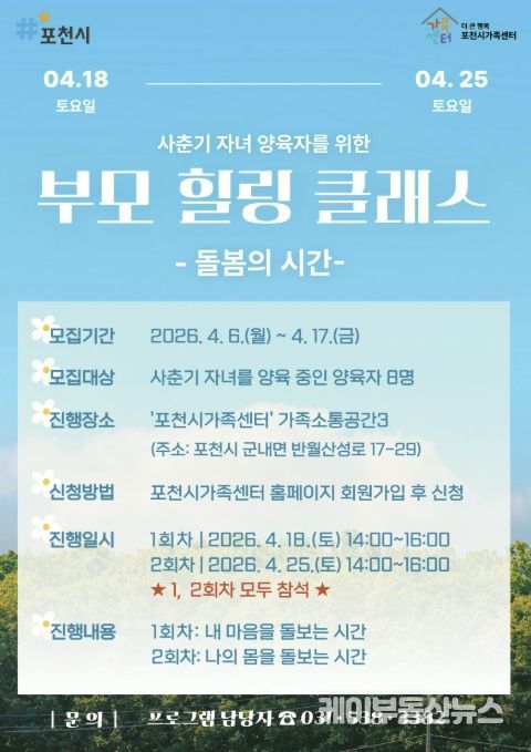 케이부동산뉴스 김교민 기자 | 포천시 더 큰 행복 포천시가족센터는 사춘기 자녀를 둔 양육자를 대상으로 ‘부모 힐링 클래스’ 참여자를 모집한다.