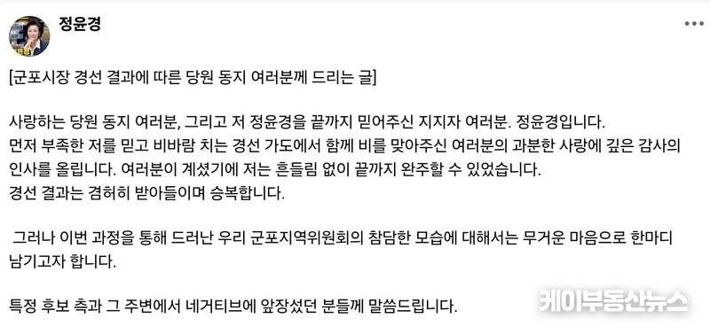 경선 과정에 대한 내부 반발도 불거졌다. 군포시장 경선에 나섰던 정윤경 경기도의회 부의장은 “결과는 겸허히 승복한다”고 밝히면서도, 경선 전반에 대해 강한 유감을 표했다.