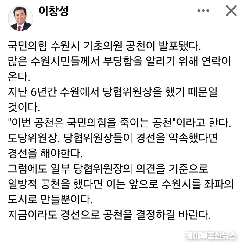 여기에 수원지역 당협위원장을 지낸 이창성 전 위원장도 공개 비판에 가세했다. 이 전 위원장은 14일 자신의 페이스북을 통해 “이번 공천은 국민의힘을 죽이는 공천”이라며 “경선을 약속했으면 반드시 지켜야 한다”고 주장했다.
