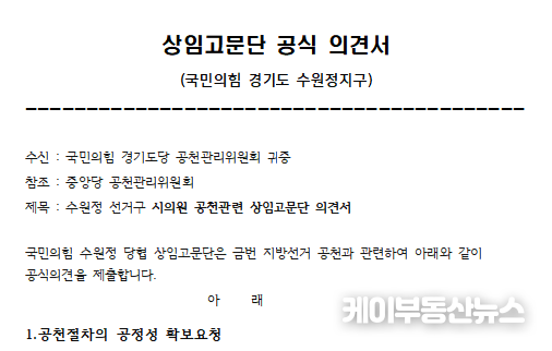케이부동산뉴스 김교민 기자 | 국민의힘 수원지역 기초의원 공천을 둘러싼 논란이 ‘절차 무시’ 논란으로 확산되고 있다. 특히 수원정 당협 상임고문단이 공천 한 달 전 공식 공문을 통해 경선 필요성을 제기했음에도 단수공천이 강행되면서 “사전 경고가 사실상 묵살됐다”는 비판이 당내에서 거세지고 있다.