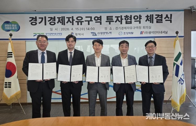 케이부동산뉴스 김교민 기자 | 경기경제자유구역청은 15일 경기경제청 8층 회의실에서 평택시 및 자동차부품, 반도체, 화학 제조기업 5개사(㈜왕성이노텍, 조양메탈㈜, ㈜광석인터내셔날/그 외 2개 기업 서면 협약)와 평택 포승(BIX)지구 산업시설용지 투자협약을 체결했다.