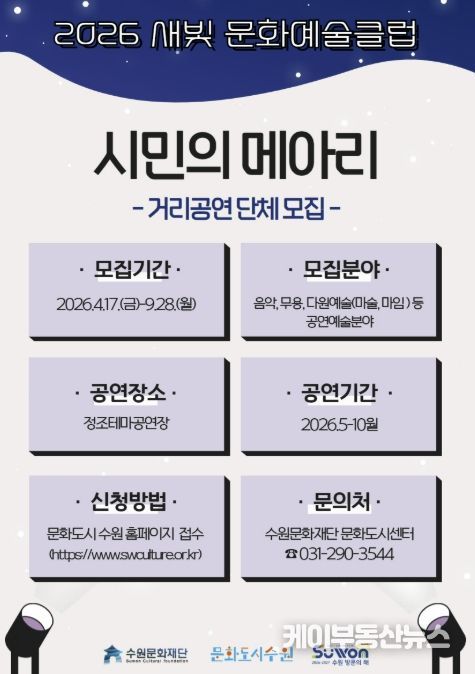 케이부동산뉴스 김교민 기자 | 수원문화재단은 지역 공연예술의 활성화와 수원시민의 주체적 문화예술 참여를 위해 ‘새빛 문화예술클럽 '시민의 메아리'’ 사업에 참여할 생활예술단체를 모집한다.