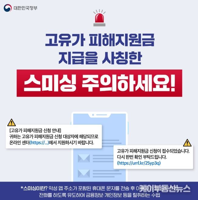 시는 시민들이 사기 문자와 공식 안내를 혼동하지 않도록 정부 알림 서비스인 ‘국민비서’ 이용을 추천했다. 국민비서 누리집에서 알림서비스를 사전에 신청하면 신청 개시일 이틀 전부터 △대상자 여부 △지원금액 △사용기한 등을 맞춤형으로 안내받을 수 있다. 만약 스미싱 의심 문자로 피해가 의심되는 경우에는 즉시 경찰청(112)로 신고해야 한다.