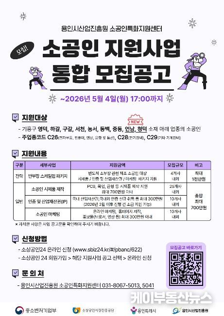 케이부동산뉴스 김교민 기자 | 용인시산업진흥원 소공인특화지원센터는 용인시 소재 소공인의 경쟁력 강화를 위해 소공인 지원사업을 본격 추진하고, 참여기업 총 49개사를 모집한다고 밝혔다.