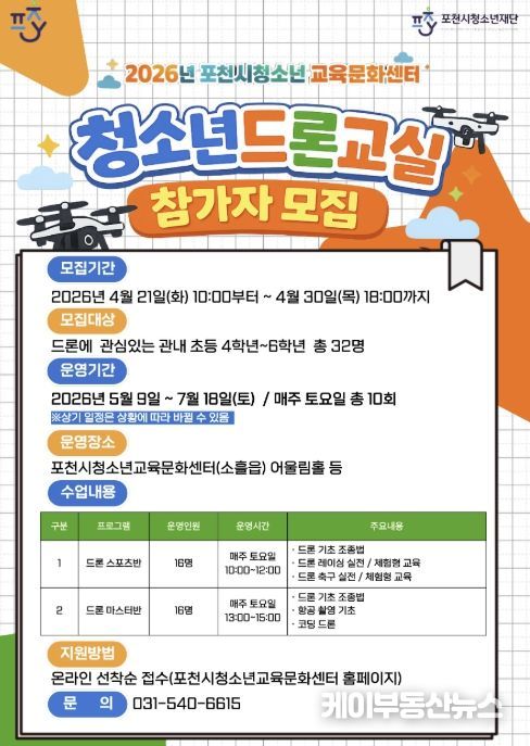 케이부동산뉴스 김교민 기자 | (재)포천시청소년재단 포천시청소년교육문화센터는 오는 4월 21일부터 30일까지 관내 초등학교 4학년부터 6학년을 대상으로 청소년드론교실 1기 참가자를 선착순으로 모집한다고 밝혔다.