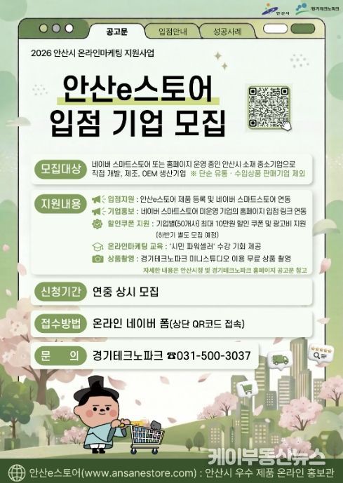 케이부동산뉴스 김교민 기자 | 안산시는 관내 중소기업의 판로 확대와 홍보 강화를 위해 안산시 우수 제품 온라인 홍보관 ‘안산e스토어’에 신규 입점할 기업을 모집한다고 23일 밝혔다.