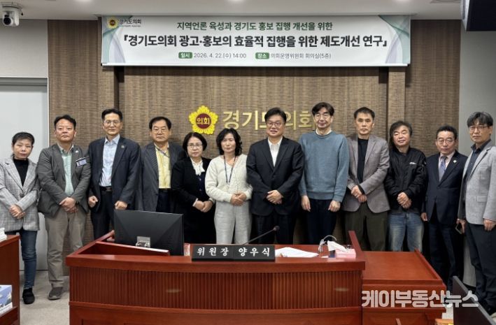 케이부동산뉴스 김교민 기자 | 경기도의회 의회운영연구회(위원장 양우식)는 지난 22일 의회운영위원회 회의실에서 '경기도의회 광고·홍보의 효율적 집행을 위한 제도개선 연구' 용역 중간보고회를 개최했다.