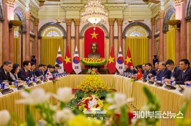 케이부동산뉴스 김교민 기자 | 베트남을 국빈 방문 중인 이재명 대통령은 22일(현지시간) 오후 베트남 국가주석궁에서 또 럼 당서기장 겸 국가주석과 정상회담을 갖고, 양국 간 포괄적 전략 동반자 관계 발전 방안과 지역·국제 정세 등에 대해 심도 있게 논의했다고 이규연 청와대 홍보소통수석이 서면 브리핑했다.