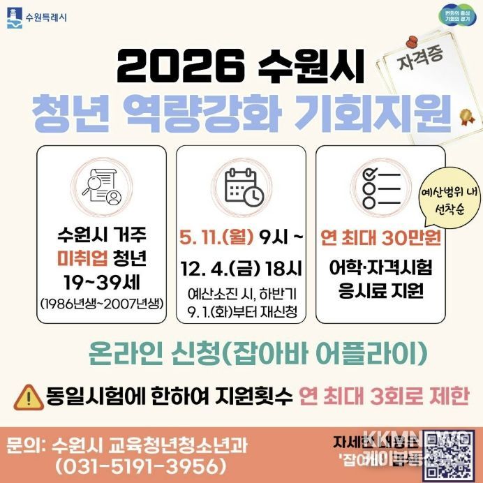 KKMNEWS 김교민 기자 | 수원특례시는 미취업 청년의 취업 준비 비용 부담을 덜어주는 ‘청년 역량강화 기회 지원 사업’을 12월 4일까지 운영한다. 미취업 청년에게 어학·자격시험 응시료를 1인당 연 최대 30만 원 지원한다.