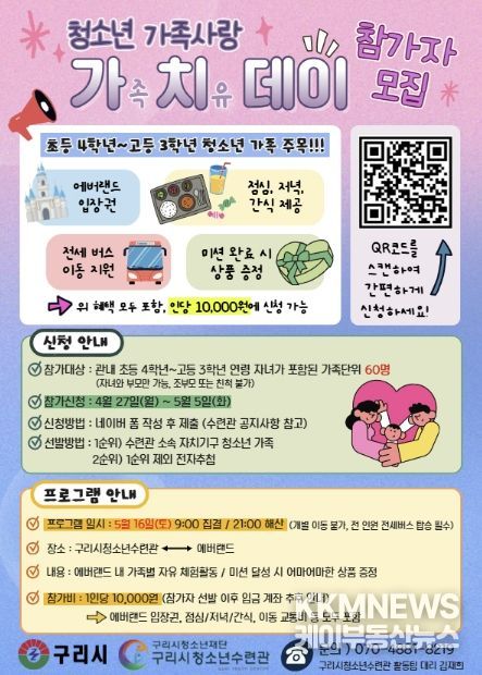 KKMNEWS 김교민 기자 | 구리시청소년재단 청소년수련관은 가정의 달을 맞아 오는 5월 16일 관내 청소년 가족을 대상으로 ‘청소년 가족사랑 가치(가족치유)데이’를 운영하며, 참가 가족을 4월 27일부터 5월 5일까지 모집한다고 밝혔다.