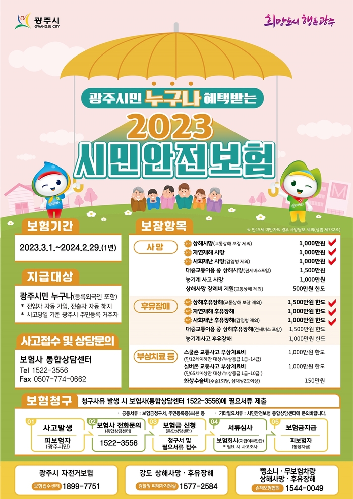 3월 1일부터 개시되는 ‘2023 광주시 시민안전보험’은 상해 사망, 자연재해 및 사회재난 사망에 대한 보장액 1천만원, 후유장해에 대한 보장으로 최대 1천500만원, 상해사망 장례비 지원으로 최대 500만원, 그 밖에 스쿨존 교통사고 부상치료비, 실버존 교통사고 부상치료비, 화상수술비 지원 등 총 14개 항목을 보장한다.
