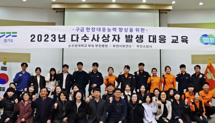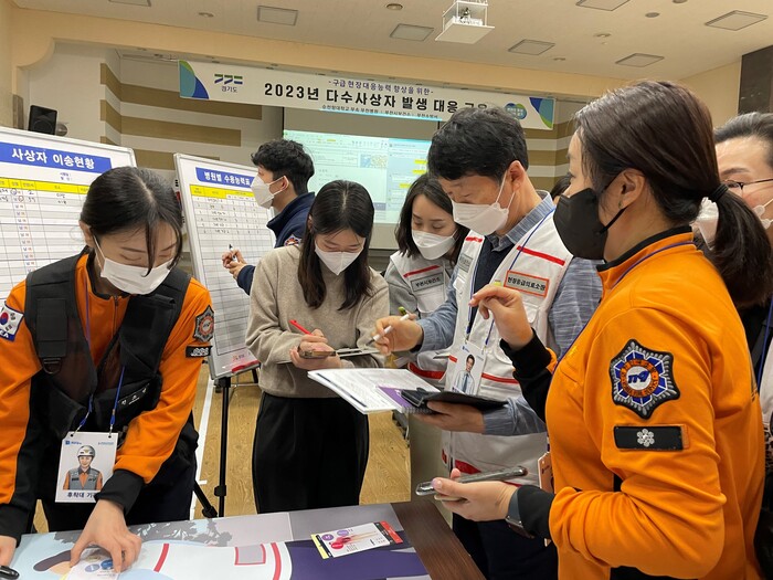 김한빛 순천향대학교 응급의학과 교수가 ▲다수사상자 발생 현장 의료대응 절차 ▲현장 상황 확인 및 연계 ▲분류·처치·이송 등의 이론 강의를 진행했으며, 경기응급의료센터가 주도해 ‘오피스텔 화재’ 시나리오를 토대로 훈련을 실시했다.