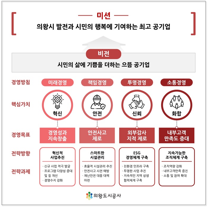 공사는 김홍종 사장의 경영방침(미래경영, 책임경영, 투명경영, 소통경영)과 주민 및 대외 이해관계자 의견수렴, 내부직원들의 실천의지를 반영한 新 경영전략을 수립하여 ‘의왕시 발전과 시민의 행복에 기여하는 최고 공기업’이라는 새로운 미션과 ‘시민의 삶에 기쁨을 더하는 으뜸 공기업’의 비전을 선포하였다.