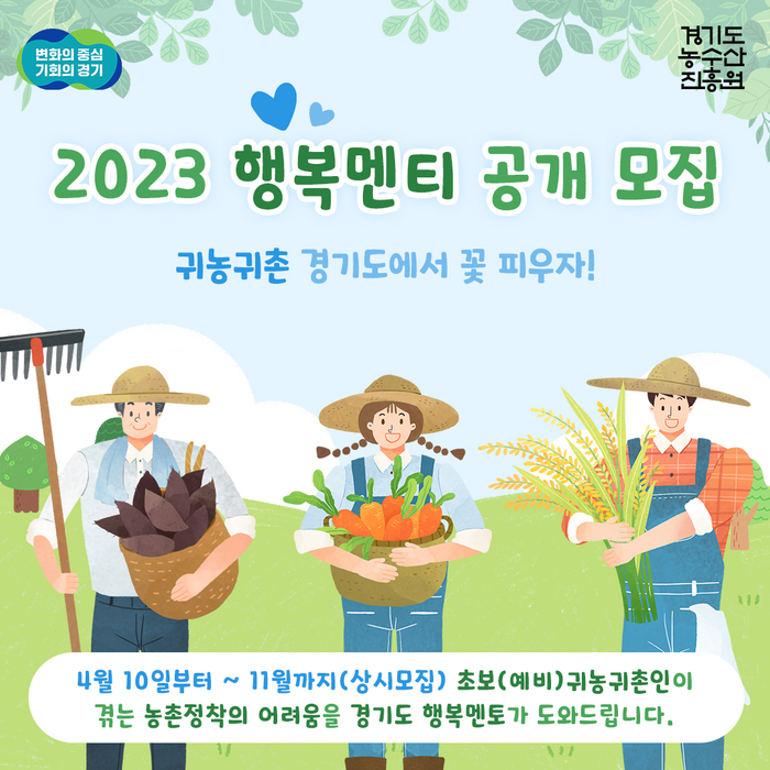 경기도와 경기도농수산진흥원이 운영하는 경기도귀농귀촌지원센터가 10일부터 ‘2023 행복멘토와 함께하는 초보 귀농인(멘티)’을 11월까지 수시 모집한다.