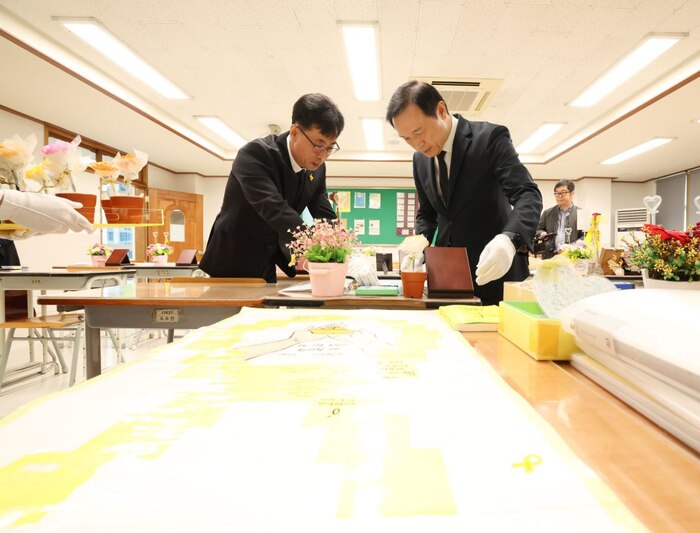 임태희 교육감은 이날 아침 직원 10여 명과 4.16민주시민교육원 ‘단원고 4.16기억교실’을 찾아 참사 희생자들 책상에 추모의 마음을 담은 종이꽃을 일일이 헌화했다.