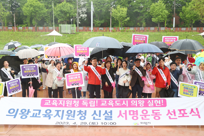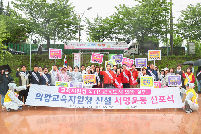 의왕시 학부모대표 중심으로 구성된 ‘의왕교육지원청 신설 추진위원회’는 지난 29일 학의천변에서 통합교육지원청 분리를 위한 범 시민 서명운동의 본격적인 시작을 알리는 서명운동 선포식을 개최했다.