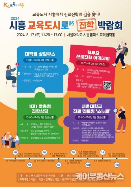 케이부동산뉴스 김교민 기자 | 시흥시는 시흥진로체험지원센터, 시흥시인재양성재단, 시흥교육지원청과 공동 주최로 8월 17일 11시 20분부터 17시까지 서울대학교 시흥캠퍼스 교육협력동에서 ‘2024년 시흥 교육도시로(路) 진학 박람회’를 개최한다.