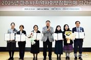 케이부동산뉴스 김교민 기자 | 파주시는 지난 3일, ‘지혜의 숲’대회의실에서 '2025년 지역사회보장협의체 성과공유회’를 개최했다. 이번 행사에는 대표협의체, 실무협의체, 분과위원, 읍면동 협의체 위원 등 150여 명이 참석했으며, 공공위원장 김경일 시장과 민간위원장 이보경 위원장이 공동으로 주관했다. 올해 성과공유회는 ‘함께라서 빛났던 2025년, 반짝이며 나아갈 2026년’을 주제로, 한 해 동안 지역 복지를 위해 헌신한 협의체 활동을 돌아보고, 현장의 성과를 확산하기 위한 취지로 마련됐다. 행사 전 참여자들이 작성한 붙임쪽지는 행사장 앞 성탄절 나무에 장식되어, 각자의 바람과 격려가 하나의 공동체적 상징으로 모아졌다. 성탄절 나무 쪽지 걸기 시연회는 올 한 해 서로 간에 다져온 협력의 의미를 되새기고, 다가오는 2026년을 향한 희망을 함께 공유하는 시간으로 이어졌다. 1부 행사에서는 협의체 위원 소개와 함께 유공자 24명 및 특화사업 우수 읍면동 3개소에 대한 표창이 진행됐으며, 공동위원장 두 명의 기념사를 통해 한 해의 활동을 마무리하는 알림말(메시지)이 전해졌다. 이어 활동 영상 상영,