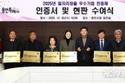 케이부동산뉴스 김교민 기자 | 용인특례시는 3일 본관 4층 전겹실에서 일자리 창출에 힘쓴 지역 우수기업 8곳에 인증서와 현판을 수여했다. 이번에 선정된 기업은 ▲아산디앤씨 주식회사 ▲일승푸드 제2공장 ▲주식회사 에이치에스씨 ▲㈜인실리코젠 ▲주식회사 홈체크 ▲㈜휴먼인텍 ▲케이제이건설산업(주) ▲트루션 등 총 8개사다. 시는 1차 서류심사와 2차 현장실사를 거쳐 일자리 창출 실적, 고용 안정성, 기업의 성장 가능성, 근로환경 등을 종합적으로 평가해 우수기업을 선정했다. 이들 기업은 최근 1년간 총 74명(기업당 4~19명)을 신규 채용해 지역 내 일자리 창출에 기여했다. 또, 다양한 직원복지제도로 근무하기 좋은 환경을 조성해 일자리의 질을 높이는 데 크게 힘쓴 것으로 평가됐다. 이들 기업에는 인증서와 현판이 수여되며, 시가 주최하는 일자리사업, 기업지원사업 참여 시 가점이 주어진다. 일자리박람회 등 채용 행사에도 우선적으로 참여할 수 있다. 용인특례시 일자리창출 우수기업 인증제는 2018년부터 시행되고 있으며, 매년 고용 확대와 일자리 창출에 기여한 기업을 발굴·지원하고 있다.