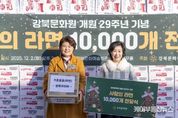 케이부동산뉴스 김교민 기자 | 강북구의회 김명희 의장(번1·2동, 수유2·3동)은 지난 12월 2일, 강북문화예술회관 소나무홀에서 열린 강북문화원 개원 29주년 기념 ‘사랑의 라면트리’ 행사에 참석해 지역 이웃을 위한 나눔 활동에 함께했다. ‘사랑의 라면트리’ 행사는 강북문화원이 주민들로부터 받아온 관심과 성원을 어려운 이웃들에게 되돌리기 위해 마련한 사회공헌 행사로, 올해로 3회째를 맞았다. 한국마사회 지원사업으로도 선정되며 지역의 대표적 나눔 행사로 자리잡았다. 행사는 라면 전달식을 시작으로 설장구 식전공연, 유공자 표창, 문화공연 등 다양한 프로그램으로 채워졌다. 특히 올해는 강북미술협회가 20여 점의 작품을 기증해 ‘그림 기부전’을 함께 열며, 문화와 나눔을 결합한 새로운 형태의 기부가 주목을 받았다. 김명희 의장은 황정희 문화원장과 함께 라면 전달식에 참석해 정성을 모은 라면 1만 개를 어려운 이웃에게 전달할 준비를 마쳤으며, ‘2025 서울시 구의원 한마음 체육대회’에서 받은 ‘아차상’ 상금도 문화원에 기부해 뜻을 더했다. 김명희 의장은 “3년째 이어지는 ‘사랑의 라면트리’가 이제는 지역