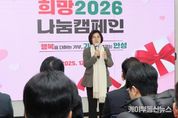 케이부동산뉴스 김교민 기자 | 안성시는 12월 4일 경기 사회복지공동모금회와 함께 ‘희망 2026 나눔캠페인’ 행사를 열고, 연말연시 따뜻한 나눔 분위기 확산에 나섰다. 이날 행사에는 김보라 안성시장을 비롯하여 경기 사회복지공동모금회 김효진 사무처장 및 관계자, 그리고 지역 내 주요 기부 참여 기업인 ㈜그랜드썬기술단에스피, 한솔아이원스(주), ㈜삼양컴텍, 한일크린에너지(주), 골프클럽큐레저산업(주) 등 기업인들이 함께해 자리를 빛냈다. ‘희망 2026 나눔캠페인’은 2025년 12월 1일부터 2026년 1월 31일까지 두 달간 진행되며, 안성시의 모금 목표액은 5억 원이다. 시민과 지역 기업이 정성으로 모은 성금과 물품은 관내 어려운 이웃에게 전달될 예정이다. 행사 주요 내용으로는 캠페인 소개를 시작으로 ‘사랑의 온도탑 제막식’과 ‘명사 열매달기’ 행사가 진행됐으며, 이어 기부금(품) 전달식이 열려 본격적인 나눔캠페인의 출발을 알렸다. 김보라 안성시장은 “이번 ‘희망 2026 나눔캠페인’을 통해 따뜻한 나눔의 가치가 지역사회 전반에 퍼지길 바란다”며 “시민 모두가 동참해 어려운 이웃과 온정을 나누는