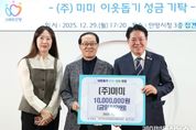 케이부동산뉴스 김교민 기자 | 안양시는 지난 29일 ㈜미미로부터 이웃돕기 성금 1천만원을 기탁받았다고 30일 밝혔다. 이날 시청 접견실에서 열린 성금 전달식에는 최대호 안양시장과 조인주 ㈜미미 회장, 조예서 전무 등이 참석했다. ㈜미미는 만안구 덕천로에 소재한 기업으로 용역·청소·경비·주택업·건물종합관리 등 다양한 분야에서 사업을 운영하고 있으며, 지역사회 나눔과 사회공헌 활동에도 꾸준히 동참하고 있다. 이번에 기탁된 성금은 안양시 이웃돕기 성금으로 사용되며, 저소득층 건강보험료 지원과 취약계층 물품 지원 등 관내 어려운 이웃을 돕는 데 활용될 예정이다. 조인주 회장은 “지역사회로부터 받은 사랑을 다시 이웃과 나누고자 성금을 기탁하게 됐다”며 “작은 정성이지만 어려운 분들께 도움이 되기를 바란다”고 전했다. 최대호 안양시장은 “연말을 맞아 따뜻한 나눔을 실천해 주셔서 감사드린다”면서 “성금은 저소득층과 취약계층 등 도움이 절실한 이웃들에게 투명하고 공정하게 전달하겠다”고 말했다.