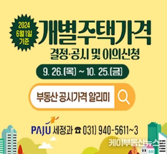 케이부동산뉴스 김교민 기자 | 파주시는 2024년 6월 1일 기준 개별주택(단독, 다가구, 다중, 주상용) 가격을 9월 26일 결정·공시하고 10월 25일까지 주택소유자나 이해관계인 등의 이의신청을 받는다고 밝혔다.