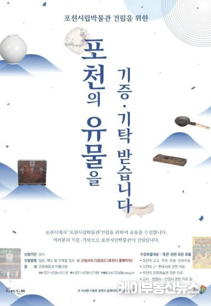 케이부동산뉴스 김교민 기자 | 포천시가 지난 7월부터 포천시립박물관 건립을 위한 '유물 기증·기탁 운동'을 실시한 가운데, 관내 곳곳에서 유물 기증 및 기탁이 이어지고 있다.