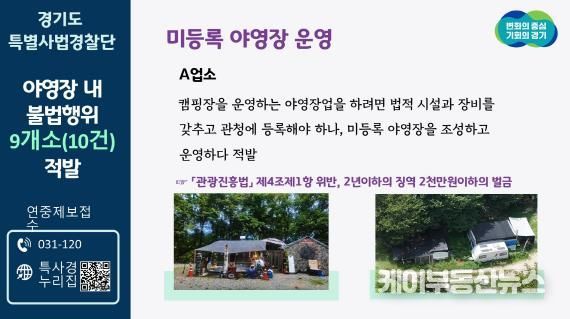 케이부동산뉴스 김교민 기자 | 경기도 특별사법경찰단은 미등록 야영장, 무허가 유원시설, 무허가 산지전용, 미신고 휴게음식점 등 야영장 불법행위 총 10건을 적발했다고 26일 밝혔다.