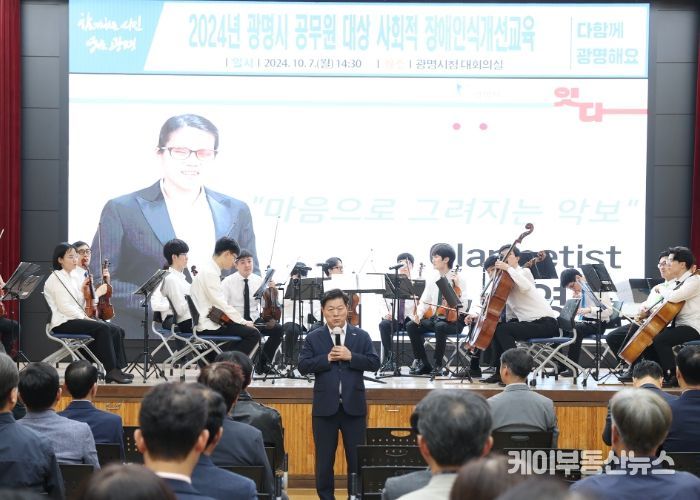케이부동산뉴스 김교민 기자 | 광명시는 7일 오후 광명시청 대회의실에서 5급 이상 간부 공무원 90여 명을 대상으로 발달장애인 오케스트라 공연 관람을 통한 장애 인식개선 교육을 실시했다.